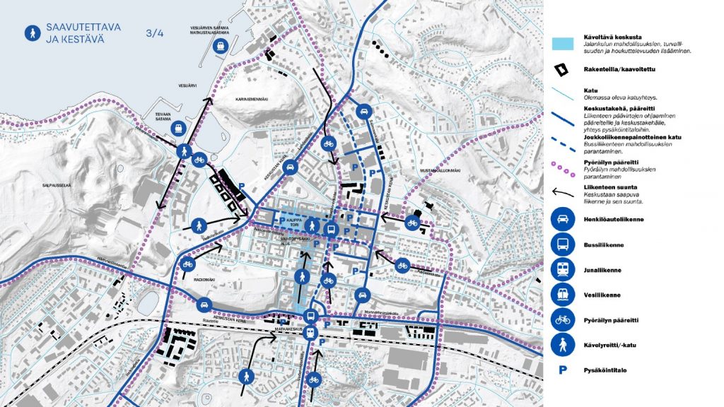 Liikenne- ja liikkumissuunnitelman toimenpiteillä varmistetaan, että keskustan asiointi on sujuvaa, vähähiilistä ja turvallista kaikilla kulkumuodoilla. Keskustassa liikutaan jalankulun, pyöräilyn ja joukkoliikenteen ehdoilla ja autoliikennettä rauhoitetaan. Keskustavisio 2030 -työn ytimessä on nykyistä selkeämpi keskustan kehäkatu ja sieltä sujuvat yhteydet pysäköintilaitoksiin.