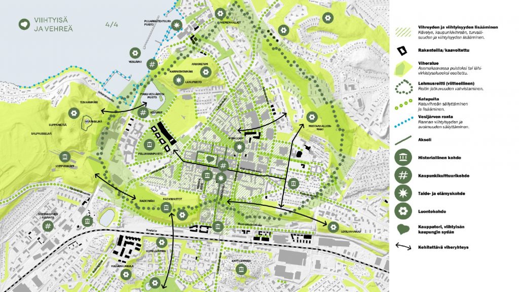 Elämyksellinen, viihtyisä ja turvallinen keskusta luo miellyttävän asuin- ja asiointiympäristön ja edistää hyvinvointia. Keskustassa vahvistetaan entisestään katutilan vihreyttä, puistoalueita ja keskustan läpi meneviä puistoyhteyksiä sekä kaupunkikuvallisesti tärkeitä maisemia ja kohteita. Katutilan elävyyttä lisätään muun muassa taiteen keinon.
