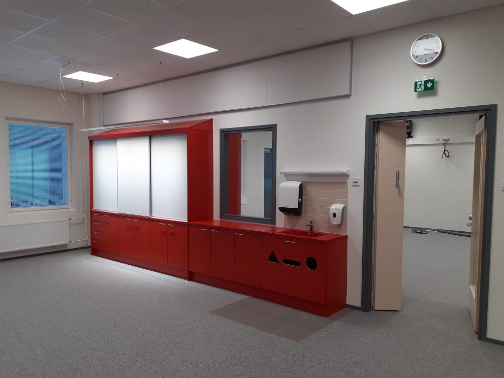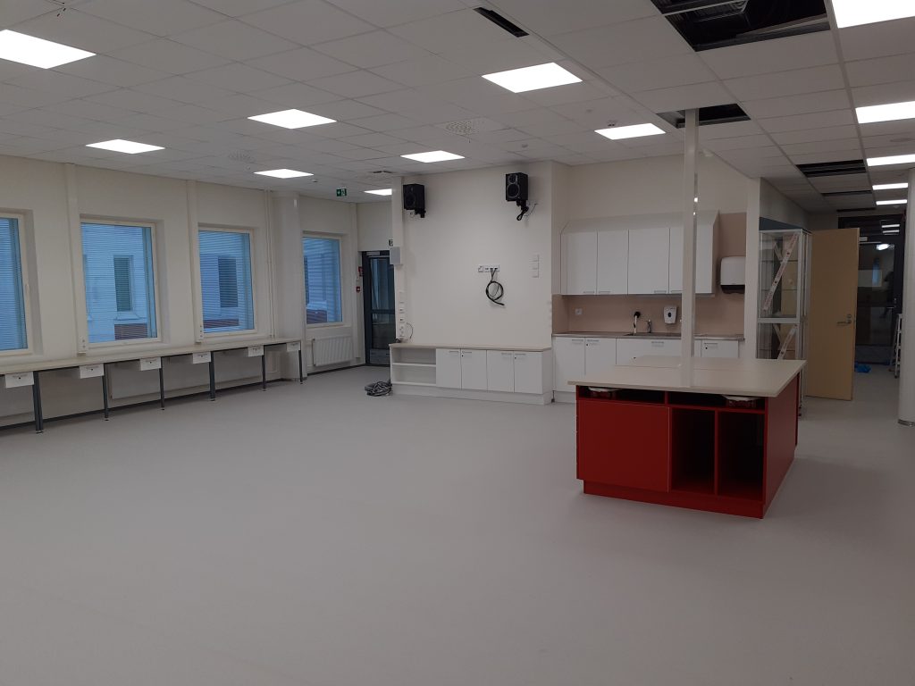 Kotitalouden oppimisympäristökin on jo viimeistelyvaiheessa. Kotitaloudella on kaksi samanlaista tilaa, joiden välissä on yhteinen kodinhoitohuone. Jokaisella opetuskeittiöllä oma värinsä.