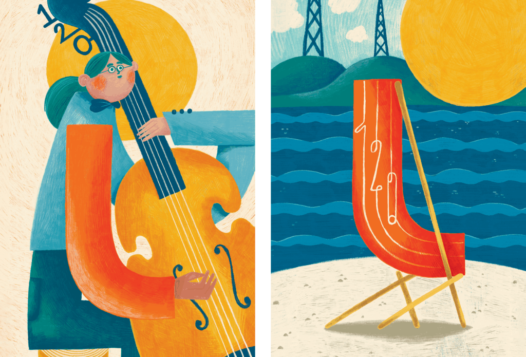 Tekemissäni julisteissa on aina jotain tunnistettavan lahtelaista. Välillä se on muoto tai maamerkki, välillä pieni yksityiskohta kuvassa. Kuvituksista voi tarkalla silmällä nähdä muotoja, jotka ovat suoraan lainattu kaupungin logosta. Esimerkiksi l-kirjain löytyy julisteista hahmon kätenä ja rantatuolina.