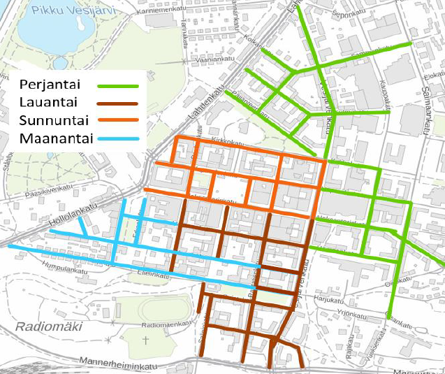 The city posts signs in areas that need to be emptied of cars approximately 2–3 days before the cleaning work begins, telling the vehicle owners there when they should move their vehicles elsewhere. Residents can move their cars to Toriparkki.
