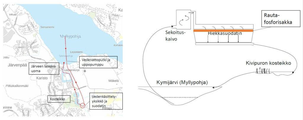 - Jatketaan Kymijärven alusveden suodatusta sedimentin ja vesikerroksen välillä kiertävän fosforin vähentämiseksi. Tavoitteena on käyttää hiekkasuodatinta kesäkuun loppupuolelta syystäyskiertoon asti vuosittain. Nykyinen suodatin mahdollistaa yli 10 l/s pumppauksen pl. suodatinkentän huoltotoimenpiteet 3-4 kertaa kesässä.