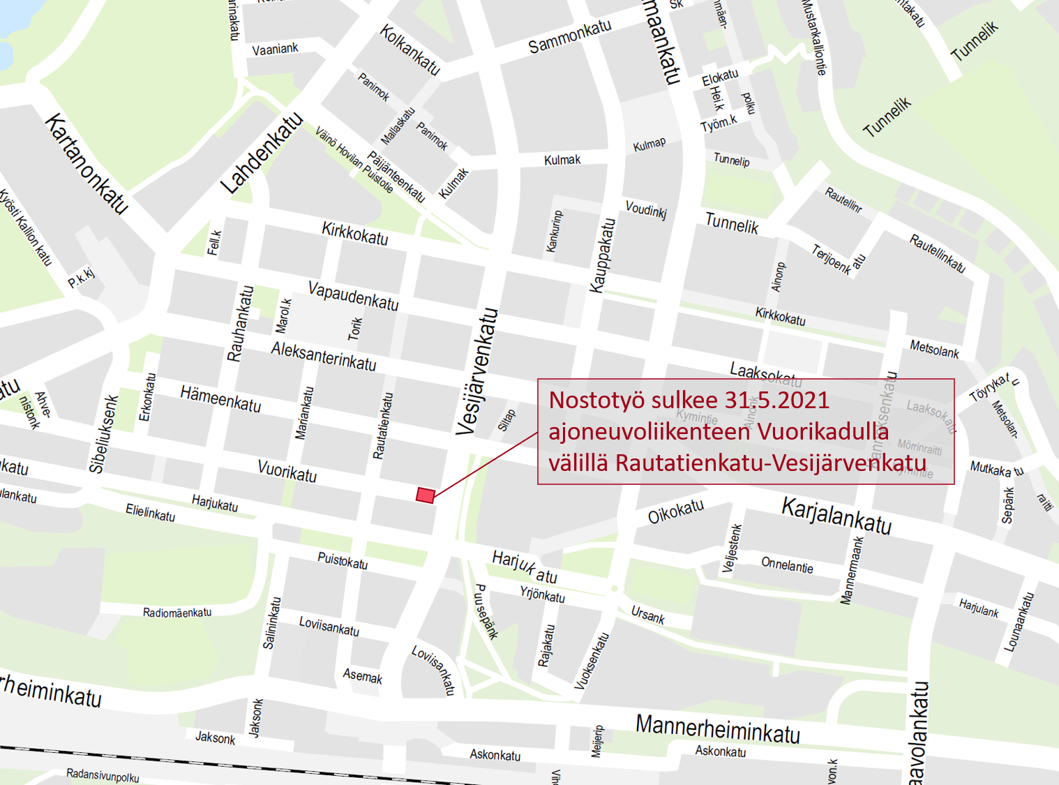 Ajoneuvoliikenne katkaistaan Vuorikadulla välillä Rautatienkatu-Vesijärvenkatu maanantaina 31.5.2021 klo 21.30 alkaen. Alueella suoritetaan nostotyö, jonka vuoksi läpikulkevan ajoneuvoliikenne joudutaan estämään. Huolto- ja tontille ajo on mahdollista koko nostotyön ajan.