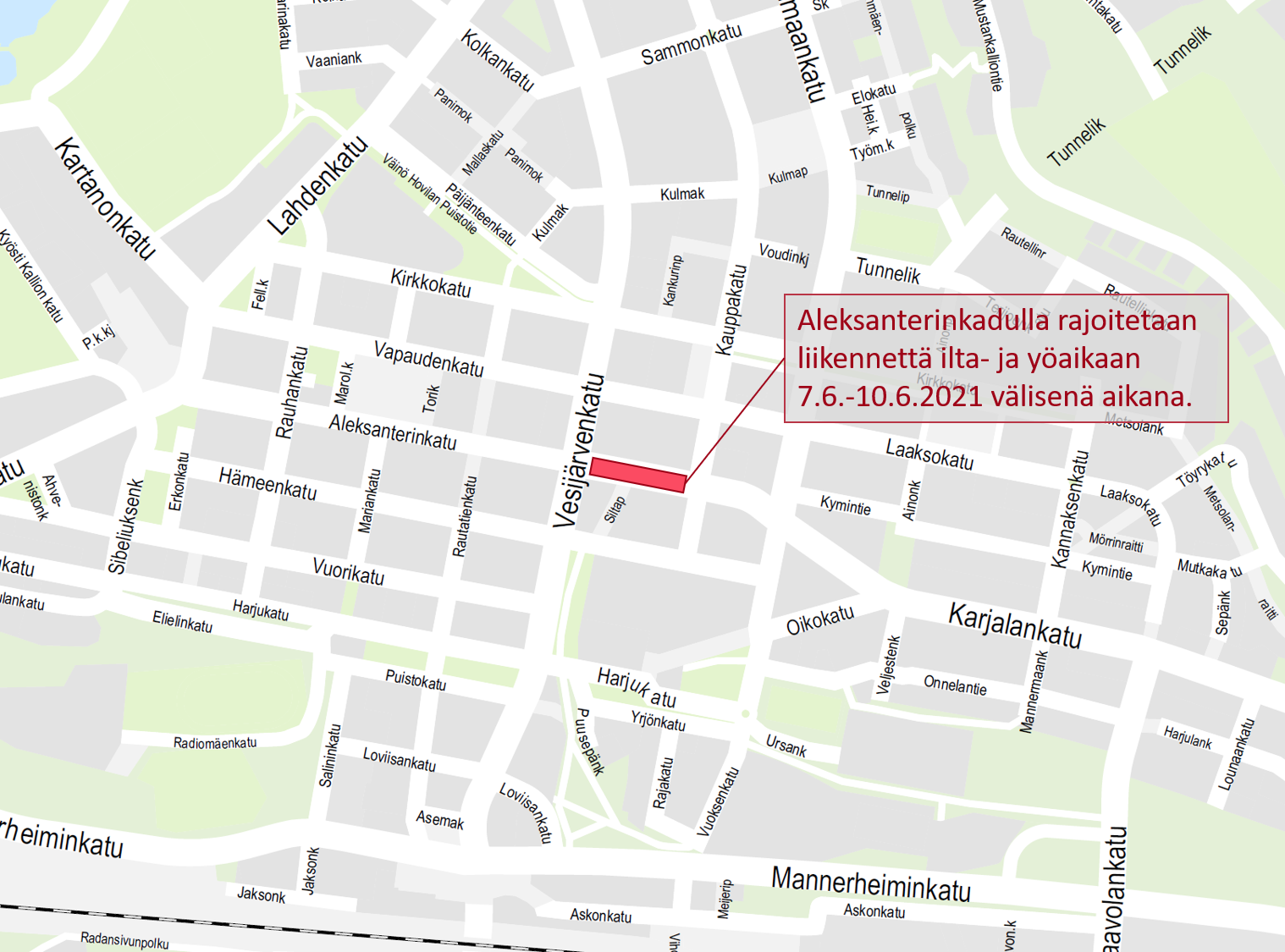Rajoituksen aikaan ajoneuvoliikenne ei pääse Vesijärvenkadulta kääntymään itään Aleksanterinkadulle Kauppakadun suuntaan ja jalankulkijat ja pyöräilijät ohjataan Aleksanterinkadun eteläreunan jalankulku- ja pyöräilyväylälle.