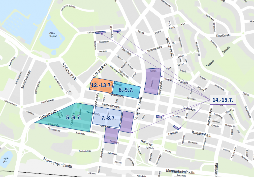 Maalattavat kohteet tai kortteliosuudet merkitään siirtokehotuksin vähintään 48 h ennen työn aloittamista. Suosittelemme seuraamaan ja noudattamaan siirtokehotuksia. Maalaustyö pyritään toteuttamaan hiljaisen liikenteen aikaan, jolloin vaikutus mm. asiakaspysäköintiin jäisi vähäisemmäksi. Joitakin yksittäisiä (karttaan merkitsemättömiä) maalauskohteita voidaan myös toteuttamaan.