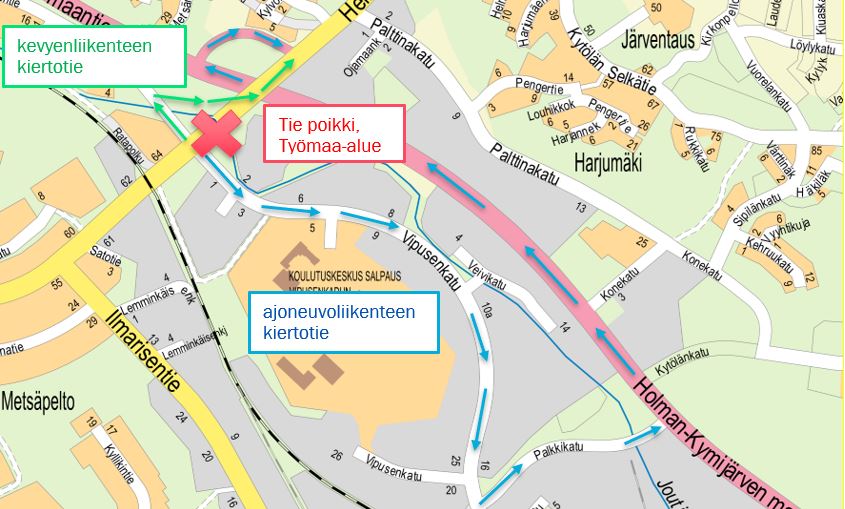 Nykyinen Heinlammintien putkisilta puretaan ja tilalle rakennetaan uusi putkisilta. Heinlammintie katkaistaan 6.6.2022- 9.8.2022 väliseksi ajaksi ja liikenne ohjataan kiertotielle. Kiertotie kulkee Vipusenkatu- Palkkikatu- Holma- Kymijärven maantie- Konekatu- Palttinakatu- kautta takaisin Heinlammintielle. Kevyenliikenteen väylän kiertotie rakennetaan Heinlammintien länsipuolelle.