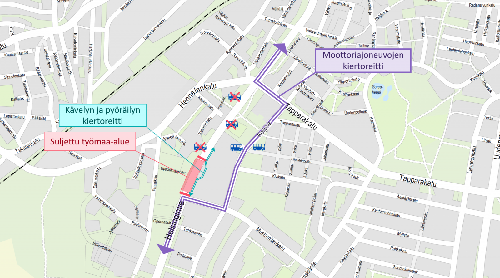 Läpiajava moottoriajoneuvoliikenne ohjataan Helsingintieltä Mustamäenkadun, Keijutien ja Tapparakadun kautta takaisin Helsingintielle. Kiertoreitin väliin jääville Helsingintien varren kiinteistöille pääsee keskustan suunnasta. Kävelylle ja pyöräilylle tehdään kiertotie työmaan vierestä.