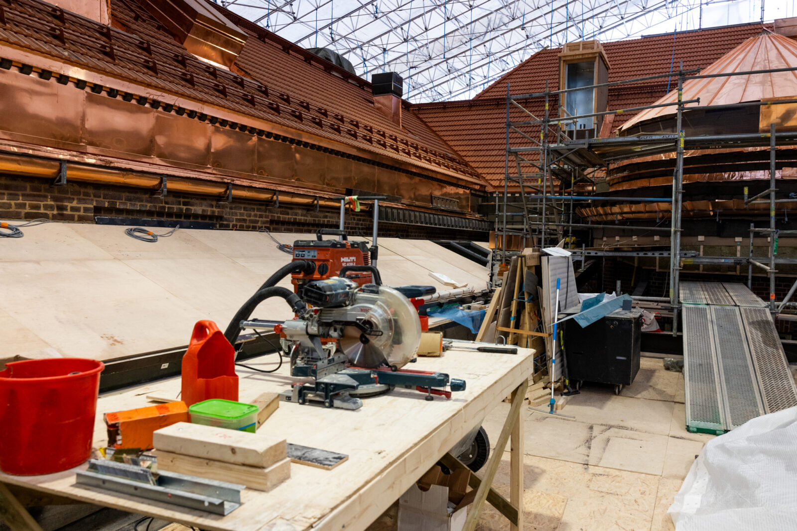 Näkyvin muutos julkisivussa aikaisempaan verrattuna on uusittu tiilikatto ja uudet kupariverhoilut. Katon uusiminen oli ajankohtaista, koska vanha tiilikate oli elinkaarensa lopussa ja sen alla olevien eristeiden kunto täytyi varmistaa sekä korjata yläpohjarakenteen epätiiviydet. Myös tornin osalta tehtiin laajoja tiilikorjauksia. Materiaalina käytetiin savitiiltä ja kuparia. Vesikatto purettiin sen kantavia rakenteita myöten. Vuosien 1940–1985 tehdyt runkorakenteet muun muassa Irma Kolsin suunnittelema paraabeliholvi 40-luvulta ja A-siiven teräsrakenteet säilyivät. Uusimisen lisäksi vanhoja patinoituneita julkisivun kuparipellityksiä irrotettiin, korjattiin ja asennettiin uudelleen paikalleen. Kaikki vesikatossa olleet kupariset koristeaiheet irrotettiin säilyttäen ja palautettiin.