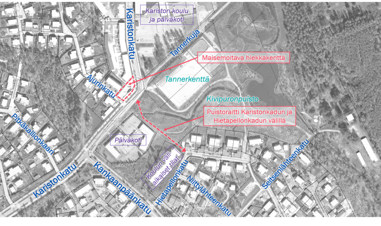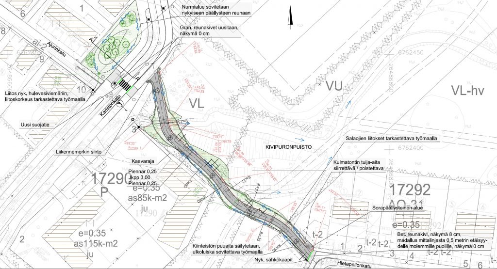 Kivituhkapäällysteinen uusi jalankulun ja pyöräilyn puistoraitti rakennetaan Kivipuronpuistoon Hietapellonkadun ja Karistonkadun välille, suunnilleen nykyisen oikopolun sijainnille. Raitin lisäksi Karistonkadun ja Ajurinkadun risteyksessä sijaitseva nykyinen hiekkakenttä maisemoidaan viheralueeksi, jossa ohjataan pintavesiä.
