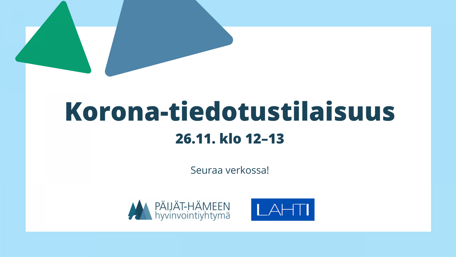 Lahden kaupunki ja Päijät-Hämeen hyvinvointiyhtymä järjestävät korona-tiedotustilaisuuden 26.11. klo 12. Ajankohtaisista suosituksista ja vaikutuksista alueen palveluihin ovat kertomassa toimitusjohtaja Marina Erhola, johtajaylilääkäri Tuomo Nieminen ja infektioylilääkäri Ville Lehtinen hyvinvointiyhtymästä, sekä kaupunginjohtaja Pekka Timonen ja sivistysjohtaja Tiina Granqvist Lahden kaupungilta.
