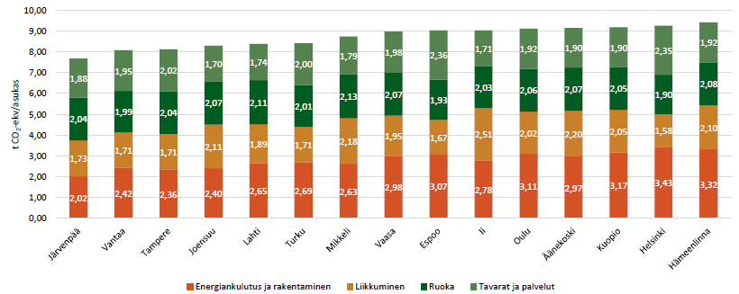Hiilijalanjälkilaskentaan on otettu mukaan energiankulutuksen ja rakentamisen, liikkumisen, ruuan sekä tavaroiden ja palveluiden päästöt.