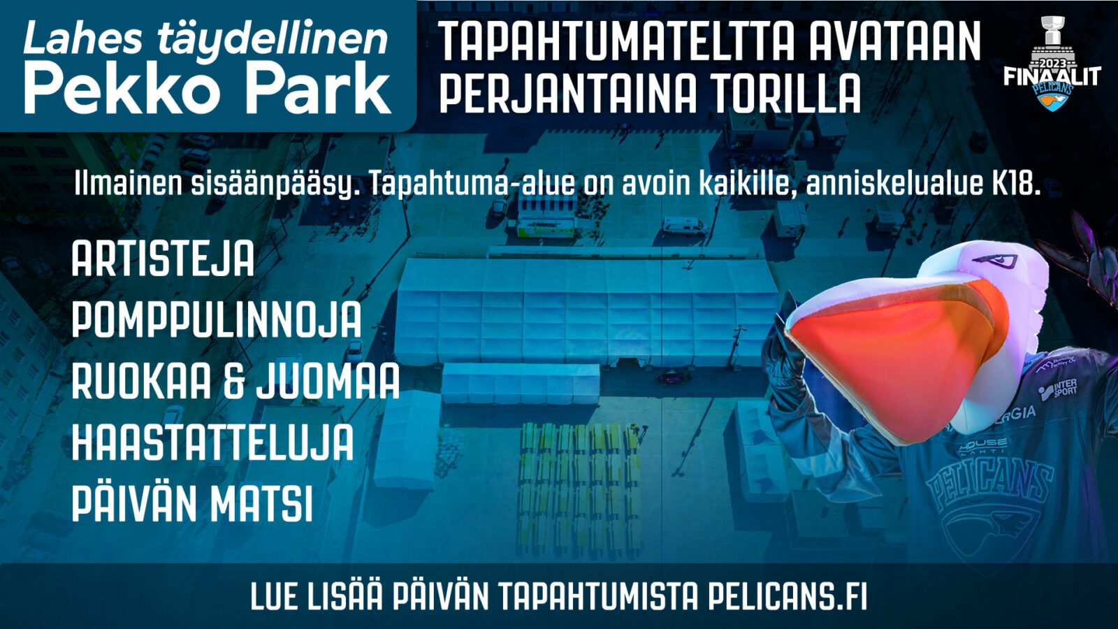 Lahden kauppatorista noin puolet vievä Pekko Park avaa ovensa perjantaina 21.4. klo 15. Alueella on pomppulinnoja, hattarakoneita, Pelicansin fanituotemyyntiä sekä iloista karnevaalimeininkiä.