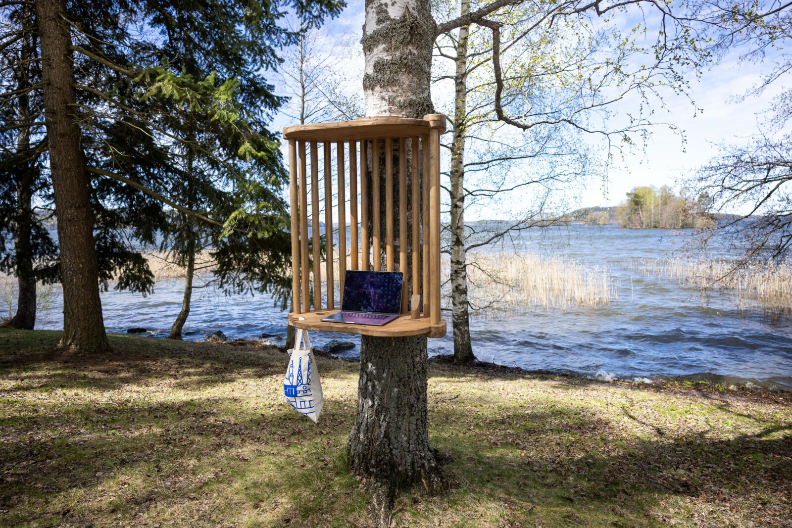 Kuusipuun käytöllä on Suomessa pitkä historia, ja materiaalina se edustaa suomalaista metsää parhaimmillaan. Työpisteet kiinnitetään niin, ettei puihin jää jälkiä asentamisen ja poistamisen jälkeen.