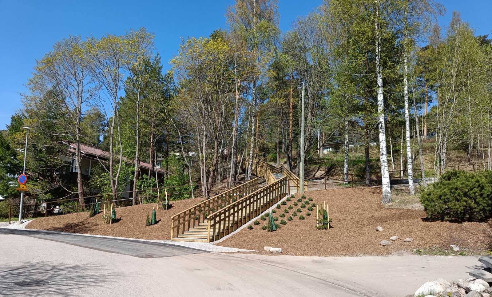 Mustankallionpuiston uudet portaat on saatu valmiiksi ja avattu käyttöön. Rautellinkadun ja Mustankalliontien välissä sijaitsevat portaat valmistuivat perjantaina. Aluetta on maisemoitu portaiden molemmin puolin sijaitsevilla istutuksilla.