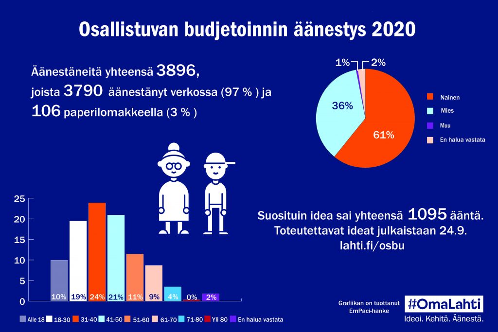 Äänestys oli avoinna kaupungin verkkosivuilla 28.8-9.9.2020. Äänestäminen oli mahdollista myös paperilomakkeella kirjastoissa ja Trion Palvelutorilla. Äänistä 97 % jätettiin verkossa ja paperilomakkeiden osuus oli 3 %. Innokkaimmin äänestivät 30-40 vuotiaat, mutta osallistuvan budjetoinnin äänestys tavoitti myös lähes 400 alle 18-vuotiasta ja noin 130 yli 70-vuotiasta. Noin 60 % äänestäneistä oli naisia.