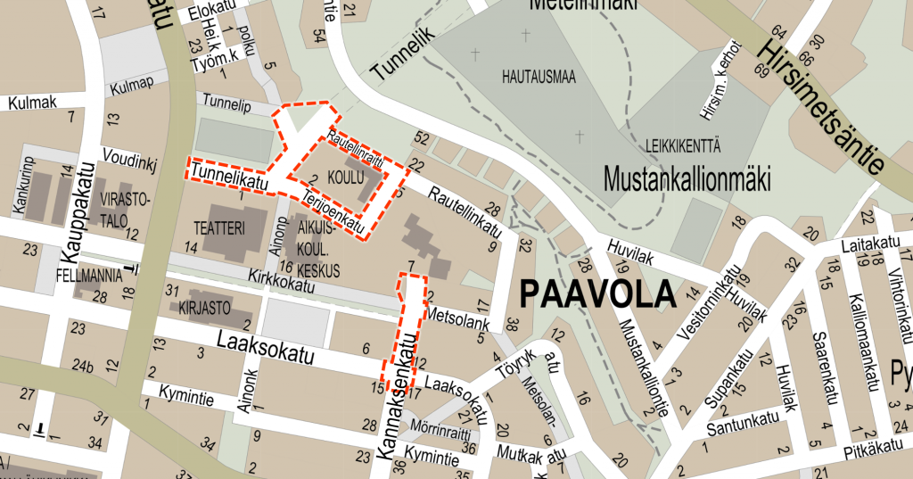 Saneerauskohteet ovat rajattu kartalle punaisella katkoviivalla.