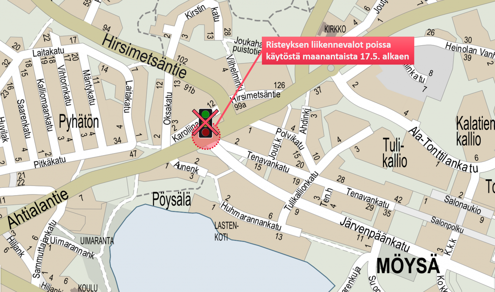 Ahtialantien rakentaminen on edennyt Aunenkadun ja Järvenpäänkadun väliselle alueelle. Rakentamisen mahdollistamiseksi Järvenpäänkadun risteyksen liikennevalot tulee poistaa käytöstä ensi maanantaista 17.5 alkaen. Rakennusurakan yhteydessä valot uusitaan ja ne voidaan palauttaa käyttöön vasta uusien liikennevalojen asennuksen valmistuttua. Uusien liikennevalojen käyttöönoton arvioidaan tapahtuvan alkusyksystä 2021.