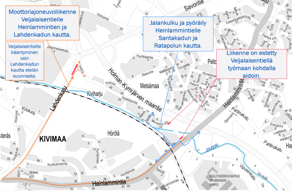 Veijalaisentie katkaistaan työmaan kohdalta ja moottoriajoneuvoliikenne ohjataan rakennettavan kiertotien kautta Veijalaisentien länsipäästä Lahdenkadulle. Moottoriajoneuvoliikenne voi kääntyä Veijalaisentielle vain Lahdenkadulta etelästä tultaessa ja vastaavasti Veijalaisentieltä voi kääntyä vain oikealle Lahdenkadulle. Kävelyn ja pyöräilyn kiertoreitti kulkee Ratapolun ja Santakadun kautta.