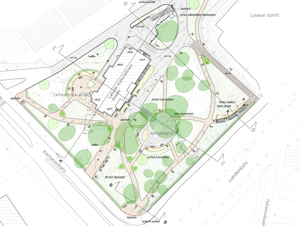 Aino-patsaan ympäristö kehitetään puiston käytäväjärjestelmän solmukohdaksi ja pysähdyspaikaksi. Liuskekiveys korjataan ja kalusteet uusitaan historiasta muistuttamaan.