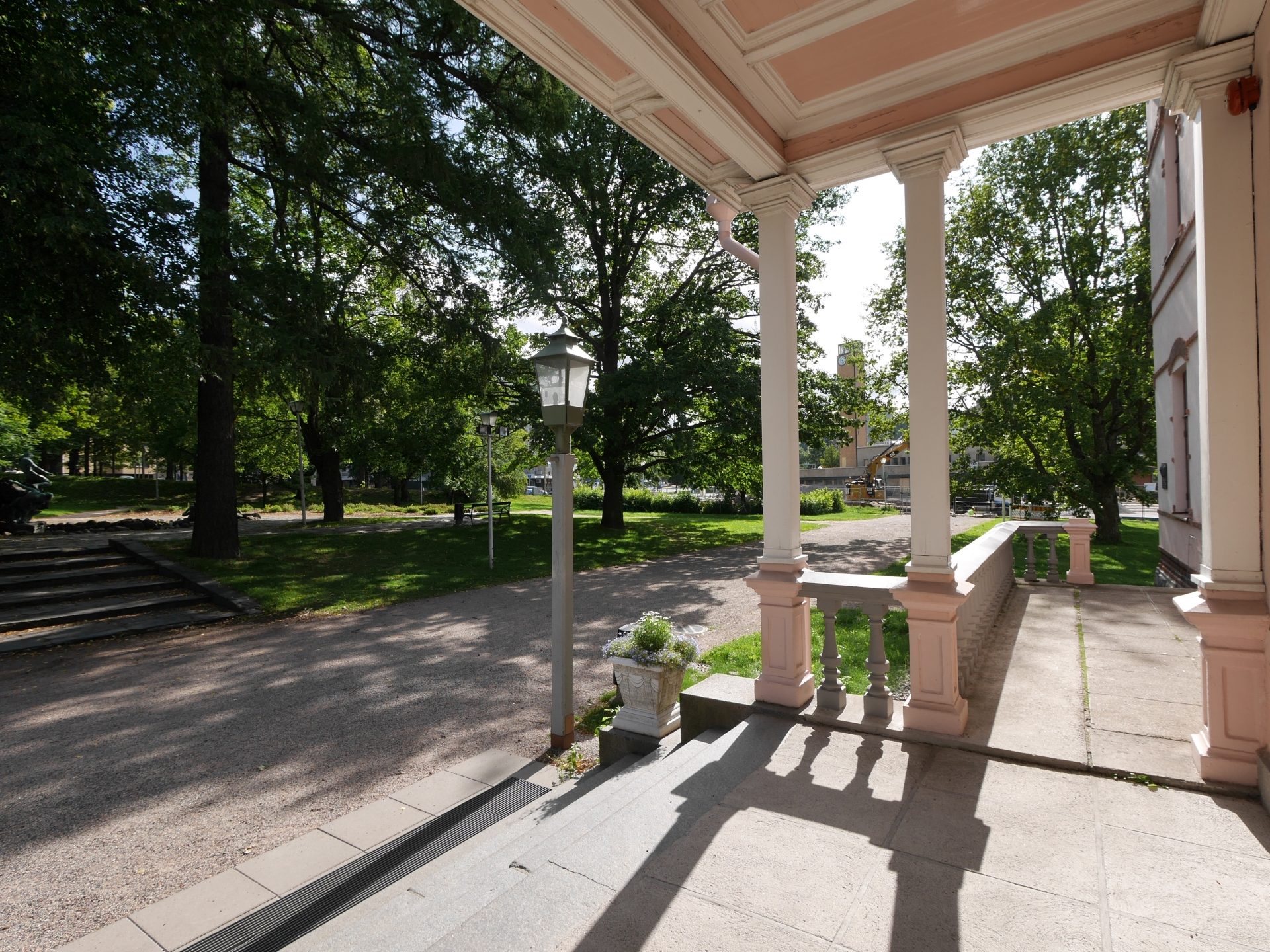 Rakennuksen länsipuolelle tehdään pieni tapahtumakenttä, joka muistuttaa vanhoista kiviportaista, jotka on siitä purettu jo 50-luvulla. Tapahtumakenttä rajataan matalalla leikatulla pensasaidalla, jonka eteen istutetaan ruusutarha ja muotoon leikattuja pensaita.