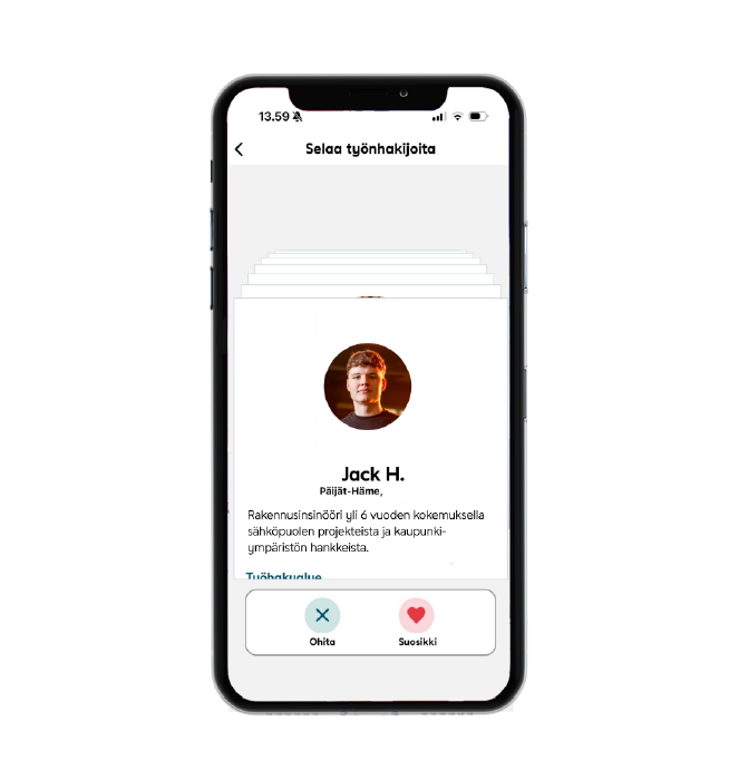 Sovellus antaa sinulle listan sopivista hakijoista ja heidän profiileistaan. Lisää hakijat suosikkeihin, avaa keskustelu ja sovi jatkosta!
